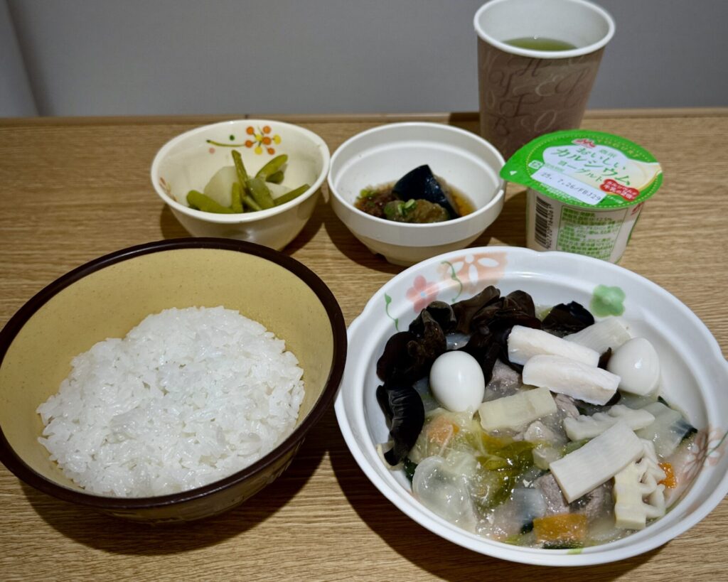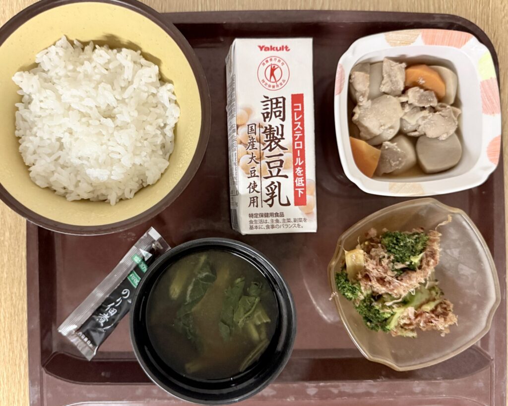 退院前ラストの朝食は、里芋と豚肉の煮物で、ほっとする日本の味でした。これぞ回復食!という感じで、自宅での食事に戻る前の準備のような気持ちになりましたね