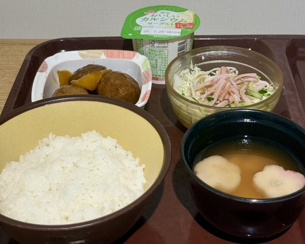 ベッドに運ばれてきたのは、味噌汁、そしてまさかの肉団子! 「お粥だろう」と勝手に想像していたので、本当に驚きました。全身麻酔から覚めたばかりで、まだ体がだるい中、食べるのが正直しんどかったのですが、この肉団子の甘辛い味付けが、麻酔でぼんやりしていた意識を現実に引き戻してくれたような気がします。「あれ?これ、全然美味いぞ」と感動したのを覚えています。