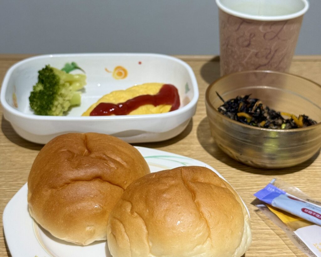 この日はパン食でした。ひじきとツナの和え物という和風のおかずが、洋風のパンと一緒に出てくるのが面白いですよね。入院中、唯一のパンだったので嬉しかったです。