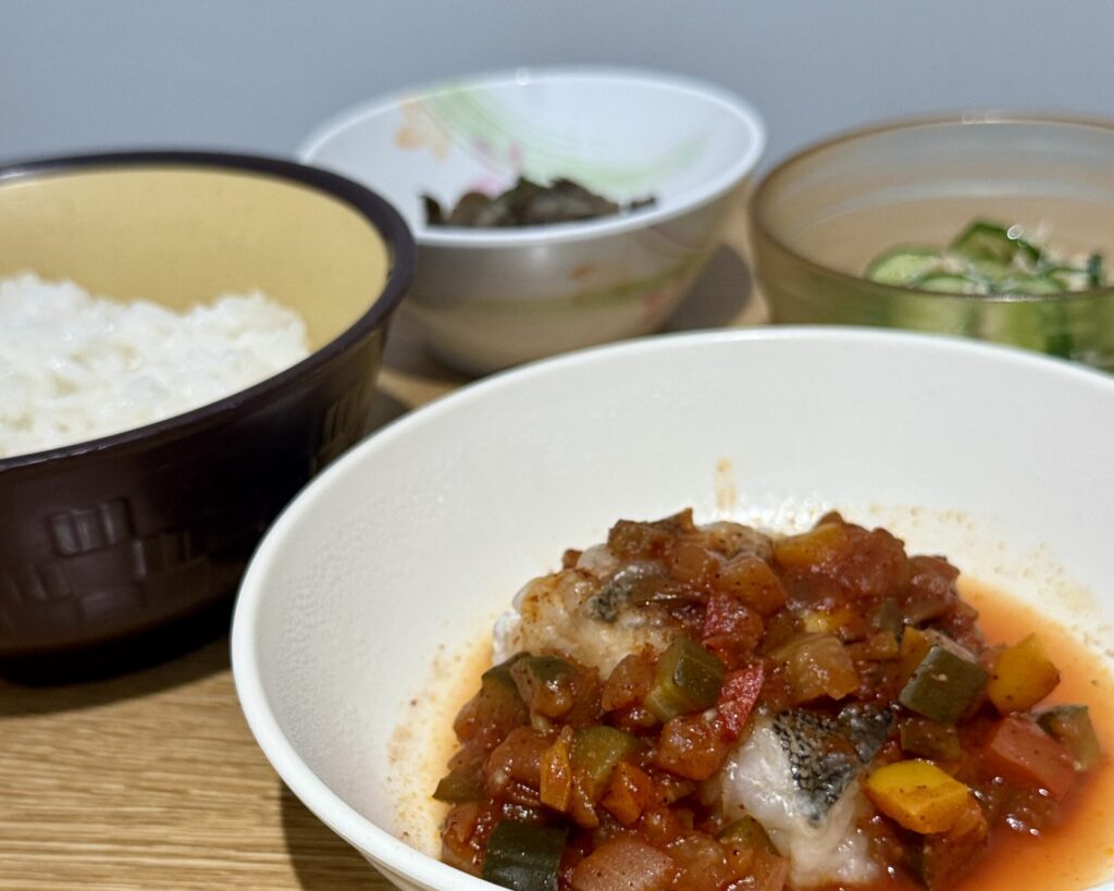タラの野菜ソースがけが、薄味ながらも風味豊かで絶品でした。ささみときゅうりの和え物もサッパリといただけて、着実に体力が戻ってきていることを実感しました。